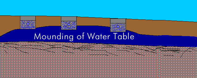 If the distance to the water table is very slight, water flows out of the trenches, and mounds up over the limiting layer.